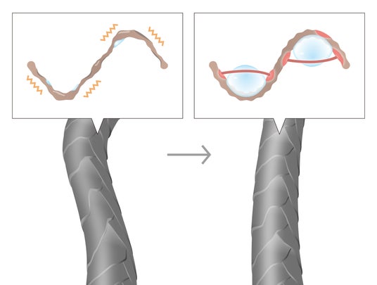 ヘアアイロンの熱で動きにくく固まった状態の毛髪内部のタンパク質を、うるおいでほぐし、ほぐした状態をケラチンでつなぎ留めます。