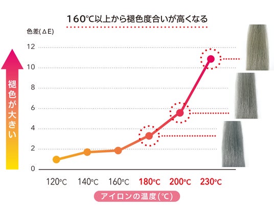 寒色系ヘアカラーに設定温度を変えて、褪色度合いを測定したところ、160℃以上から急激に褪色度合いが高くなりました。