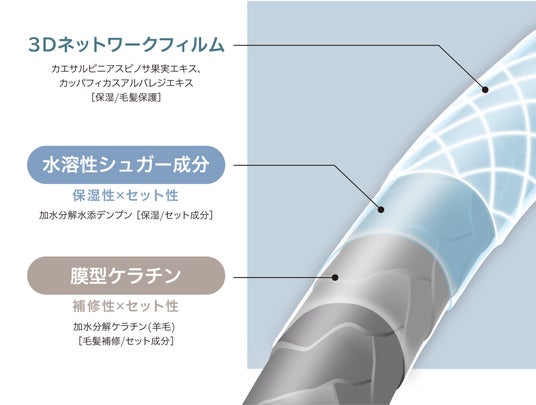 スキンケアにて使用されるハリを伸ばす成分を配合。外側で網目状に毛髪に付着。網目状で、お互いが引っ張りあう力が強いので、即効的に硬い髪でも立ち上げます。