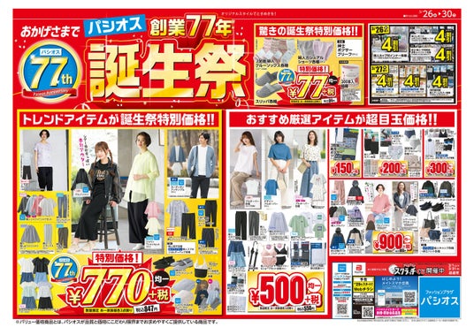株式会社田原屋(本社所在地:神奈川県川崎市、代表取締役会長:田熊 太郎、代表取締役社長:甲斐 直裕)は、3/26(水)よりファッションプラザ[パシオス]で【創業77年 誕生祭】を開催いたします。