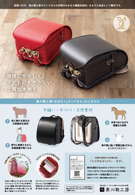 黒川鞄工房は1895年(明治28年)創業。「鞄を通じて、子どもの健やかな未来を応援」を企業理念に掲げ、手縫い、手づくり、天然素材にこだわった少量限定制作を続けています。