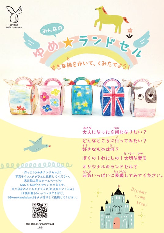 黒川鞄工房のブースでは、実際のランドセルをご覧いただけるほか、好きな絵を描いてランドセルを作ることができる紙製の工作キットを配布します。