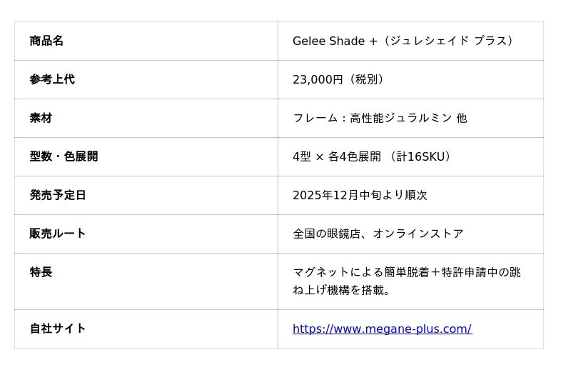 株式会社FUJIKON HOLDINGS(福井県鯖江市 代表取締役:藤田 徳之) は、高性能素材「ジュラルミン」を採用したメガネブランド「Gelee(ジュレ)」シリーズより、マグネット式クリップオンサングラスの新型モデル「Gelee Shade +(ジュレシェイド プラス)」を今年の12月中旬から全国の眼鏡店およびオンラインストアで順次発売します。