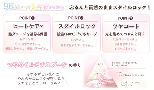*1 水を含む *2 ヘアアイロンの熱を利用し、髪を補修・保護すること *3 普段の温度を180℃とした時 *4 生体組成成分リン脂質からなる微小カプセルのこと ※1 保護 ※2 補修 ※3 イソステアロイル加水分解ケラチン(羊毛)(補修) ※4 イソステアロイル加水分解コラーゲン(補修) ※5 アミノエチルチオコハク酸ジアンモニウム(保護)※6 (アブラナ種子油/シナアブラギリ種子油)コポリマー(保護) ※7 ビルベリー種子油(保湿) ※8 アルガニアスピノサ核油(保湿) ※9 オリーブ果実油(保湿) ※10 水溶性コラーゲン(保湿) ※11 ケラチン(羊毛)(補修) ※12 保湿 ※13 保護