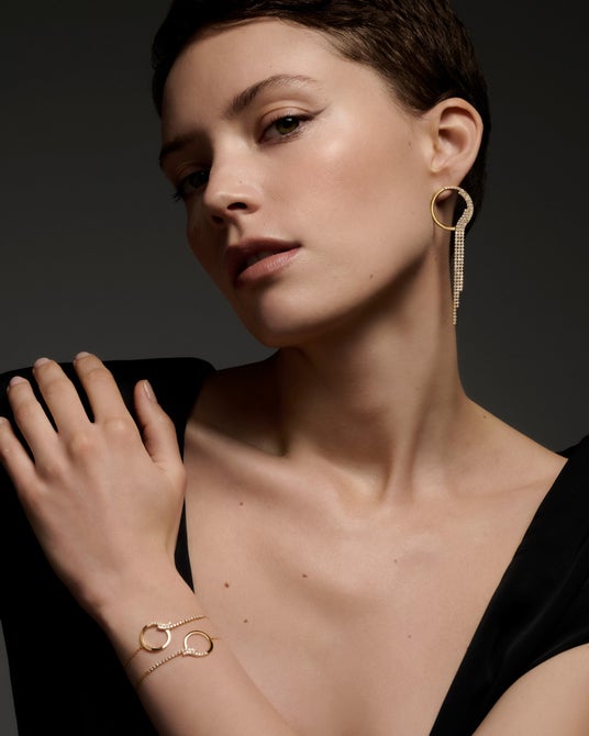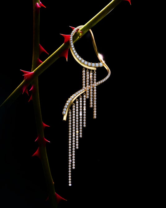今シーズンのステートメントピースである「シャンデリア ラディアント イヤーカフ」。流麗なラインを描き、耳全体をダイヤモンドの光で包み込む優美なデザインのイヤーカフは、VVSクラスのダイヤモンドを207ピースあしらったファインジュエリー。ダイヤモンドのテニスチェーンが身体の動きに呼応してしなやかに揺れ、身にまとう方と共鳴する凛とした輝きをもたらします。