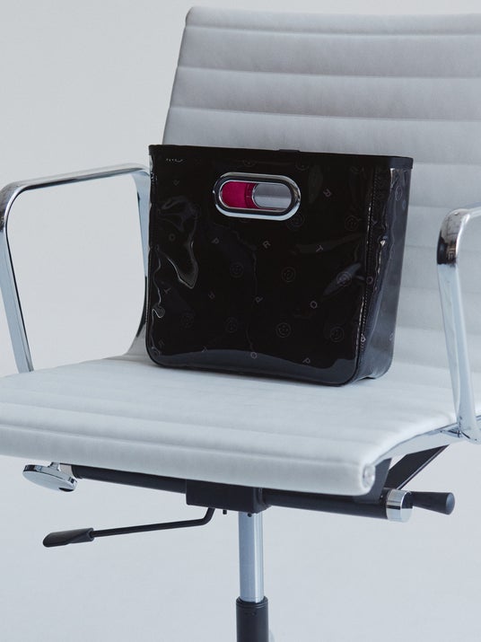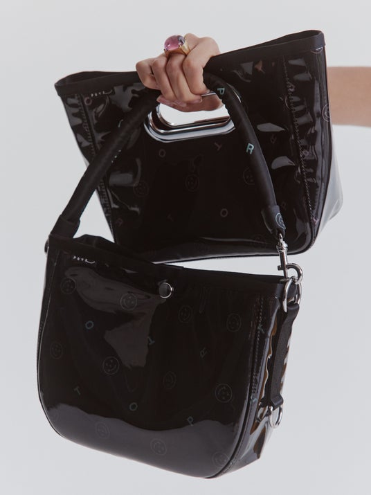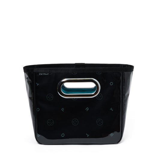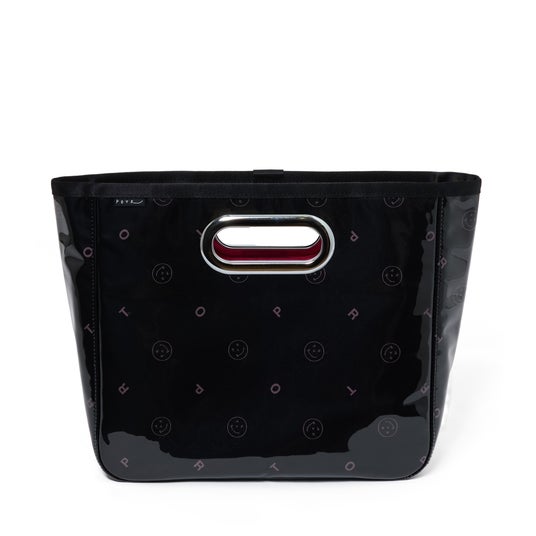 美しく繊細なジャカード織りの生地に、グロッシーなPVC素材を纏わせたバッグ本体は、光を受けてつやを放ちます。