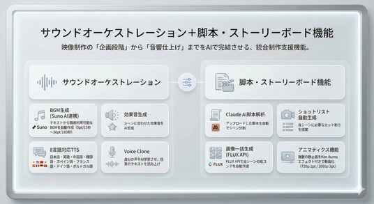 映像制作の「企画段階」から「音響仕上げ」までをAIで完結させる、統合制作支援機能。