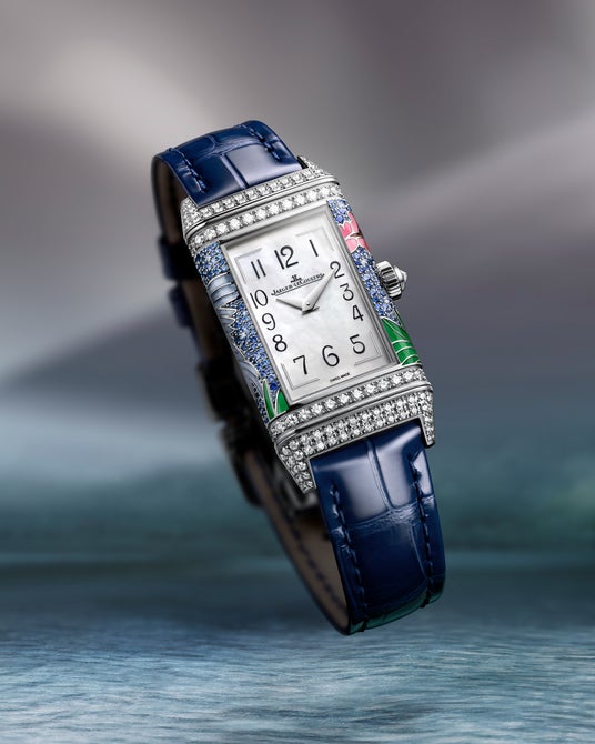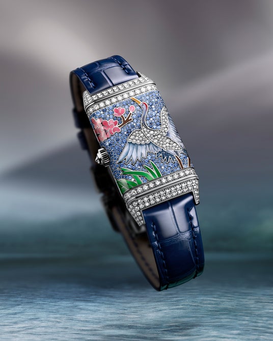 レベルソ・ワン・サクラの裏側には、桜の木の下、湖のほとりに佇む白いタンチョウヅルがあしらわれています。18Kホワイトゴールド製ケースのクールな輝きに引き立てられ、桜の花、前に広がる緑の葦、そしてタンチョウヅルの頭部、脚、羽はグラン・フー・シャンルヴェ・エナメルの技法で表現され、また、その胴体と上部の羽にはダイヤモンドがスノーセッティングであしらわれています。 精密に表現することができる細密画技法によって命が吹き込まれたタンチョウヅル。エナメル職人は細部まで描き出すため自ら筆を製作し、首羽と羽毛を一本の毛筆で描きました。メゾンのジェムセッターは、カラーストーンを用いたスノーセッティング技法を初めて採用。2色のブルーサファイアとブリリアントカット ダイヤモンドを組み合わせ、湖面にきらめく陽光を表現しました。269個のダイヤモンドと395個のサファイアのセッティングには、合計125時間が費やされています。時計には 光沢仕上げのブルーアリゲーターストラップが備えられ、ケース装飾のブルーグリーンのトーンを 引き立てます。