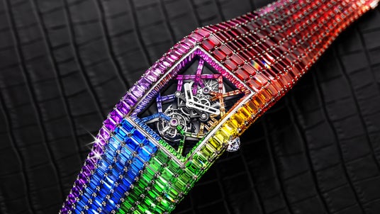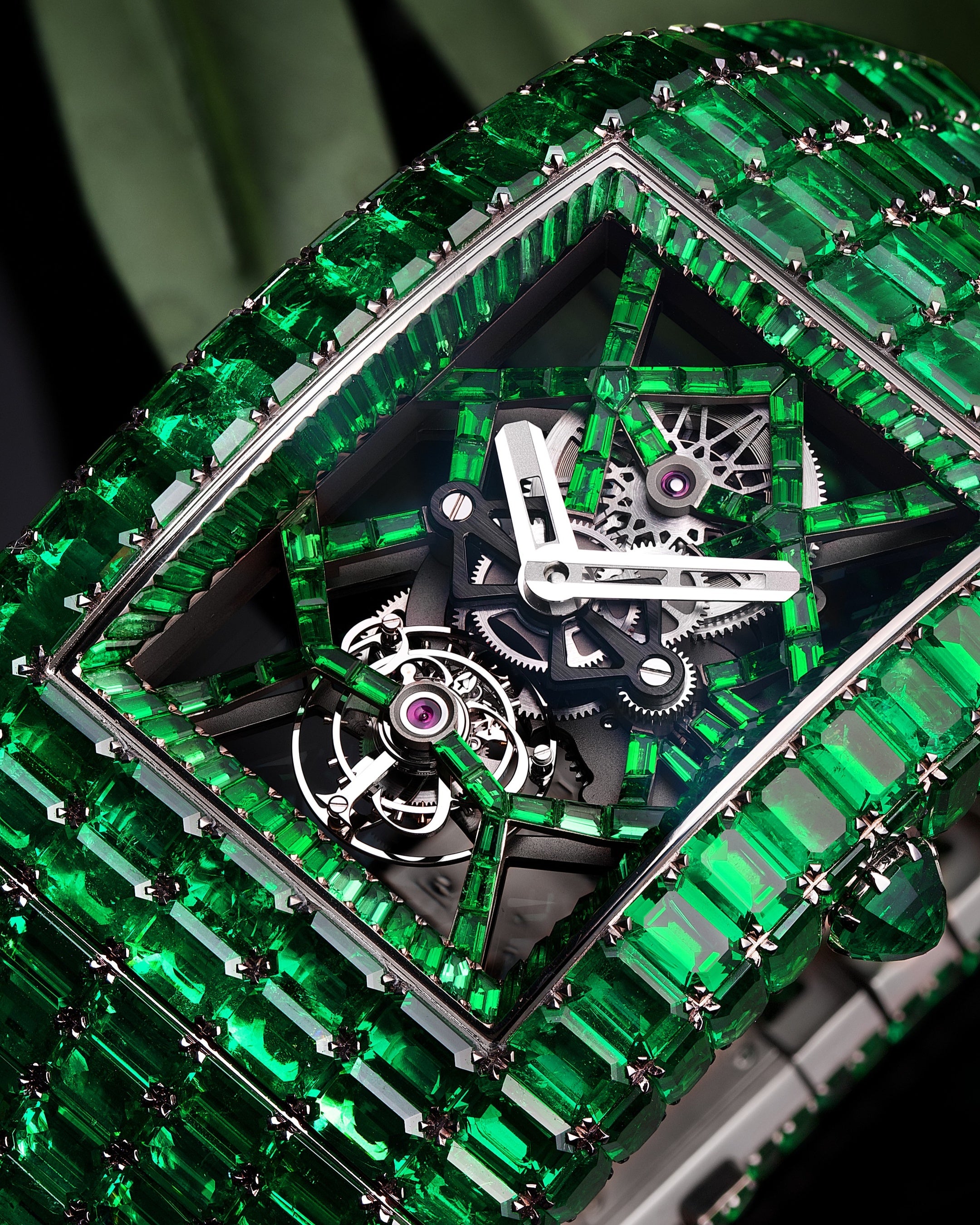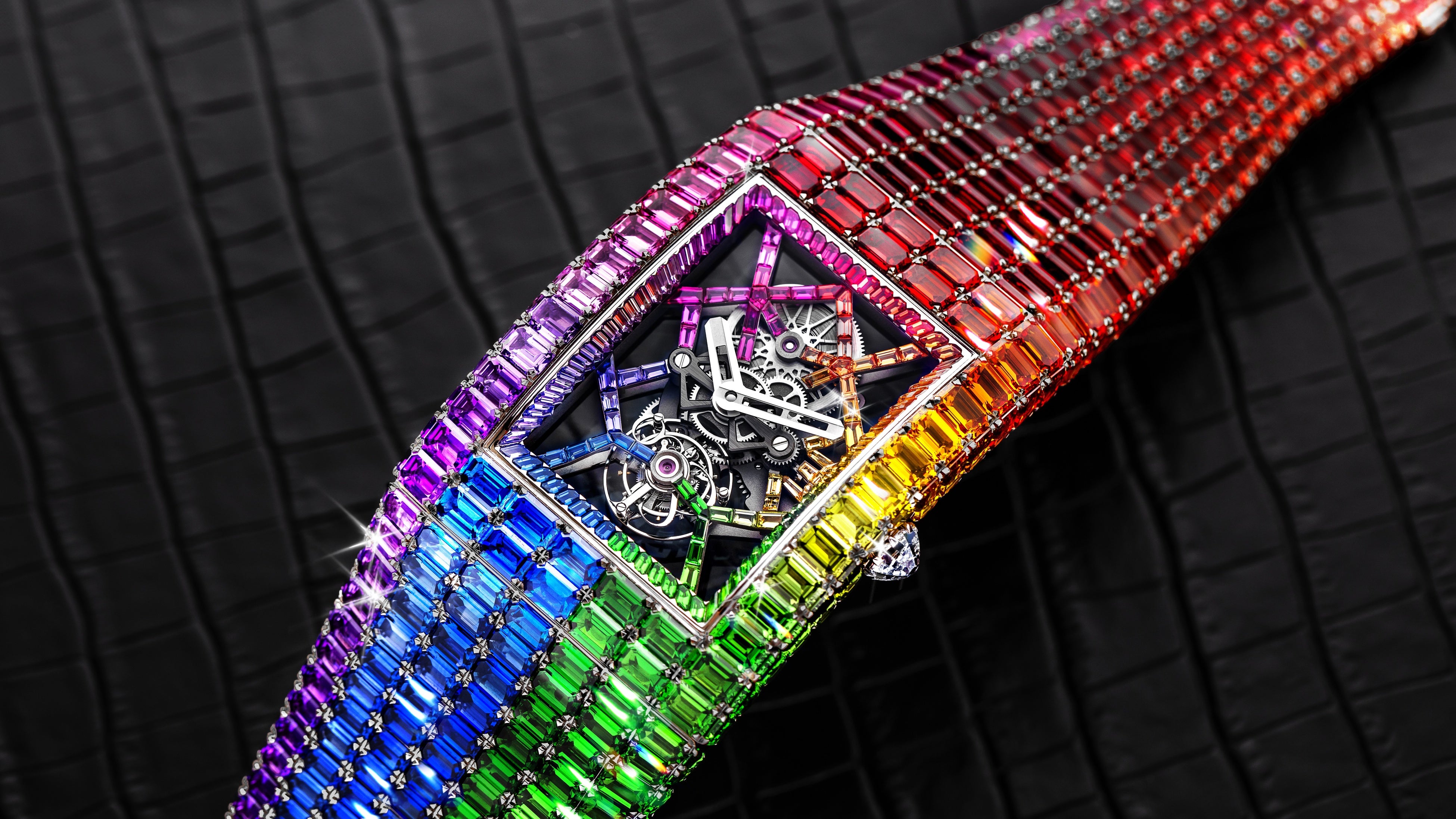 宝石で彩られたケースには、トゥールビヨンを搭載したスケルトンムーブメントが納められている