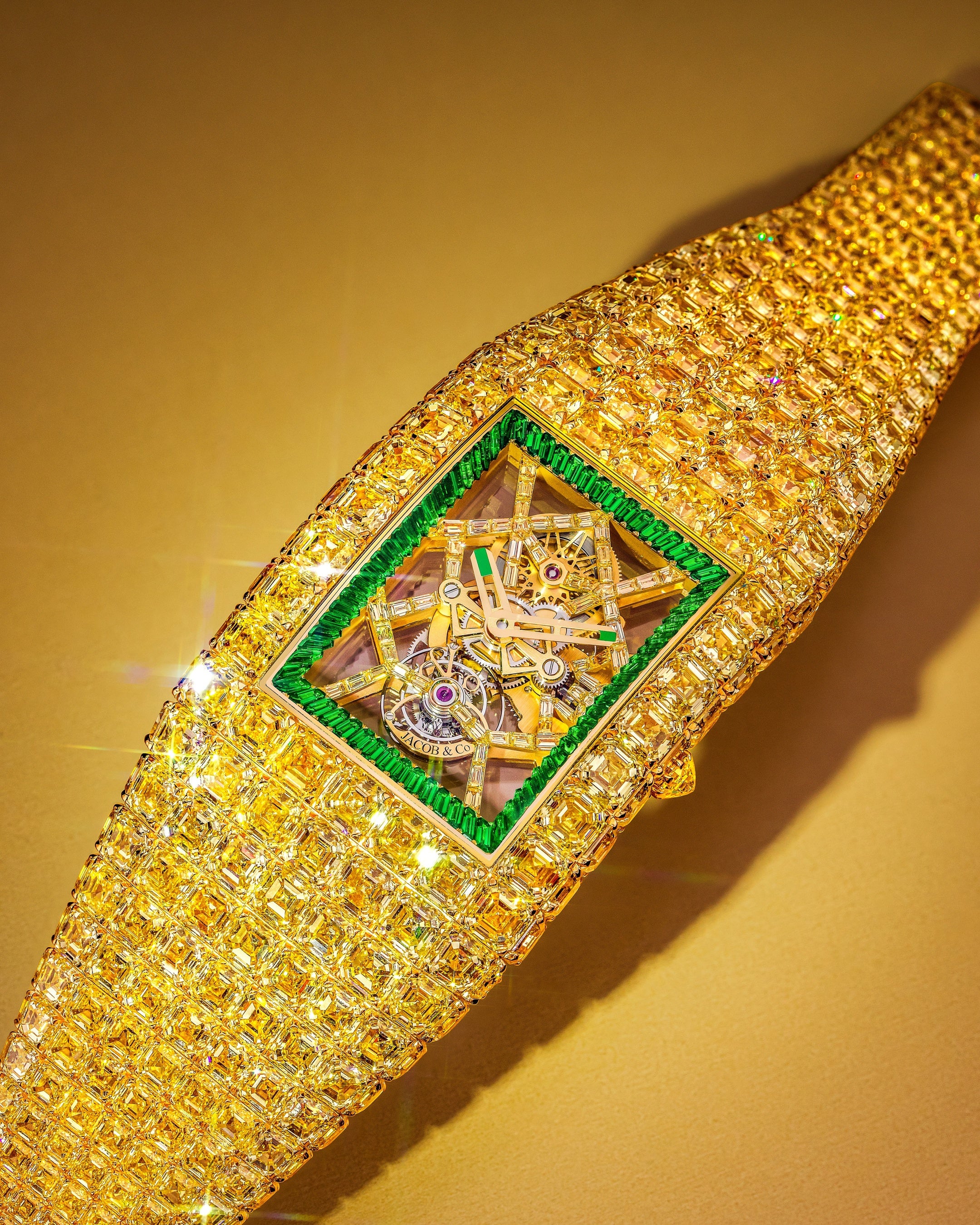 完璧に色調と透明度が一致する高品質なイエローダイヤモンドを、ひとつの時計のために数百石揃える――。それは砂漠で特定の砂粒を探すような行為であり、ジェイコブ&コーは3年半の歳月をかけ、世界各地のマーケットにおいて全神経を注いだ調達を敢行しました