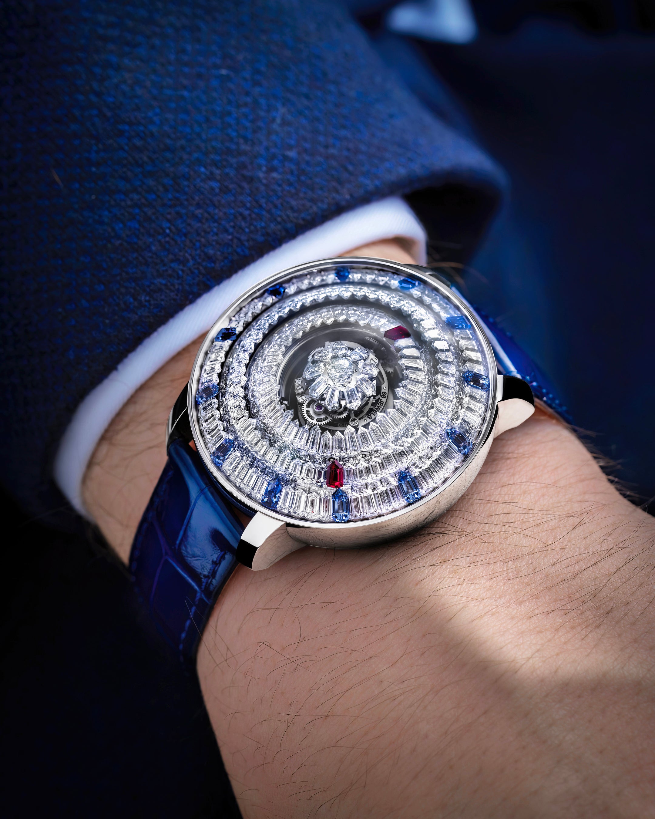 特筆すべきは、18Kゴールド製の繊細なブリッジ構造です。本来、これほど膨大な宝石を隙間なくセッティングした重厚なケースは、ムーブメントに凄まじい物理的圧力をかけます。しかし、ジェイコブ&コーは極限の肉抜きを施しながらも、構造的な安定性を完璧に維持する空間設計を実現しました。