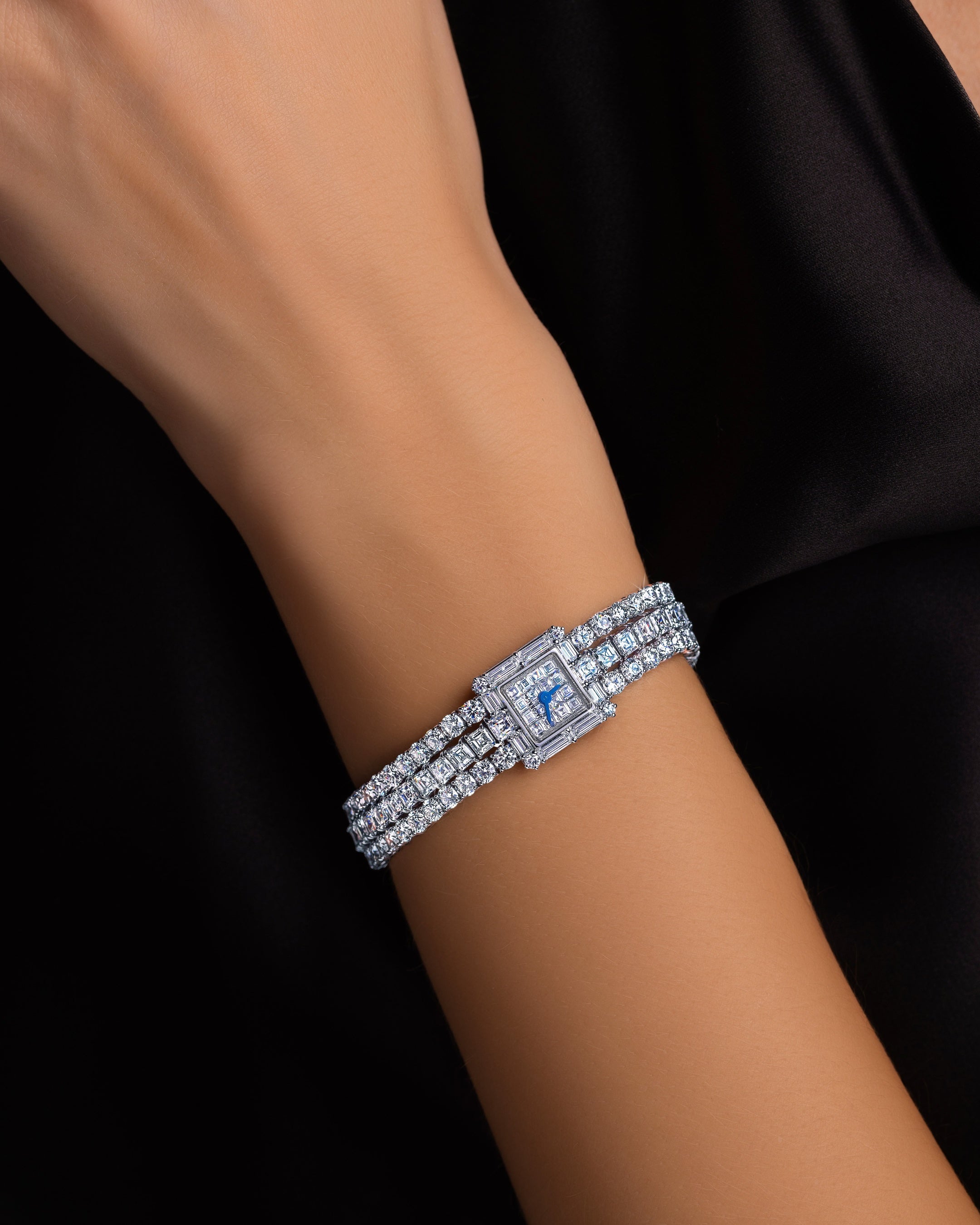 ホワイトゴールドのバングル全体に、合計424石・112.2ctものダイヤモンドを贅沢にセット。そのすべてに、時計ブランドとして唯一ジェイコブ&コーのみが使用を許されたアショカカットが施されています。さらには文字盤にもアショカカットとスクエアカットダイヤモンドを配し、時計という枠を超えた存在に仕上がっています。