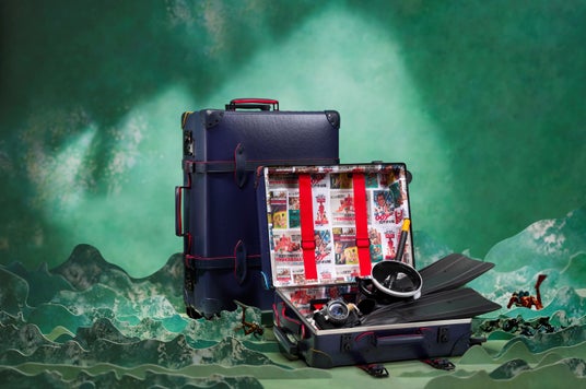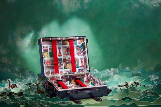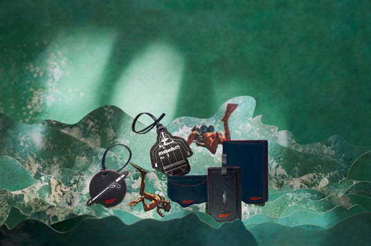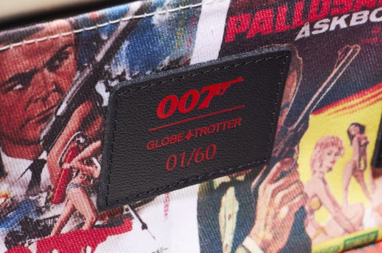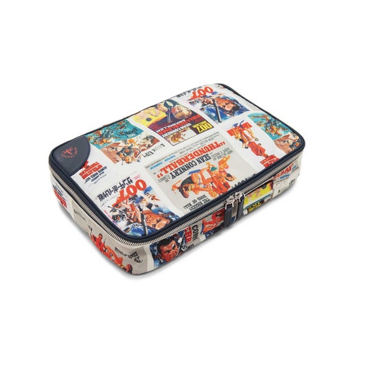 本コレクションは、クラシックなネイビーのキャリーオンケースに、同色のレザートリムを配したデザインが特徴です。コーナーレザーの縁に施された、繊細なレッド、ブルー、イエローのインクのアクセントが、映画のポスターアートを彷彿とさせます。内部には特別にデザインされたドロップインライニングを採用し、故ロバート・マクギニス氏による『サンダーボール作戦』のアクション満載のポスターグラフィックをプリント。。ケースを開くたびに驚きと懐かしさを感じさせるこの仕様は、007シリーズの色褪せないドラマ性と魅力を称えるものです。なお、本コレクションのキャリーオン、チェックインはそれぞれ全世界60台限定となります。