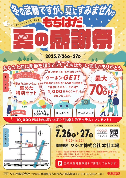 ワシオ株式会社(兵庫県加古川市、代表取締役:鷲尾岳)は、2025年7月26日(土)・27日(日)の2日間、加古川本社直営店舗にて「もちはだ夏の感謝祭」を初開催します。長年ご愛用いただいた「もちはだ」製品を回収し、感謝の気持ちを込めて当日使える1,000円分のクーポンと交換するこのイベントは、地域社会と共に「モノを捨てない」循環型社会の実現を目指す取り組みです。
