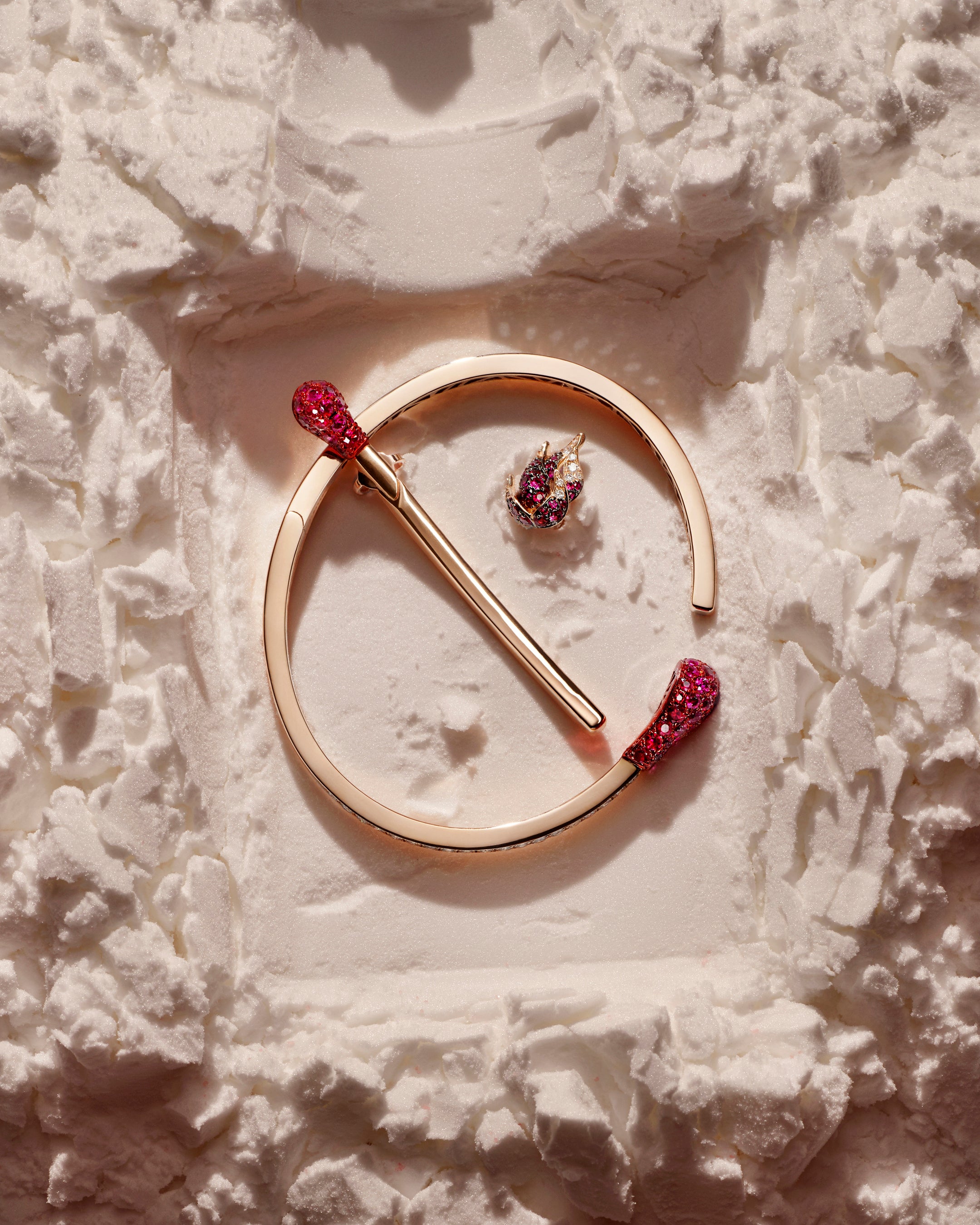 ファインジュエリーにおいて、アラボは日常の記号を強烈なアイコンへと昇華させます。手錠というアイコンをモチーフに、愛や誓いの強い結びつきを象徴的に表現した「ラブロックダウン」や、マッチに踊る炎から着想を得た、真の愛に点火する不滅の炎を象徴する「マッチ」。さらに、馬具(鐙:あぶみ)の機能的な造形美を宿す「エストリボ」、愛の方向性を示す不朽のパワーを象徴する「スーパーアロー」などの象徴的なアイコンをモチーフにした様々なコレクションが展開されています。