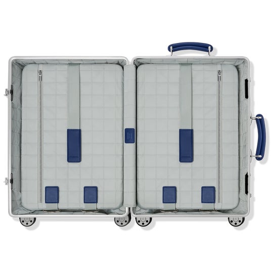 本コレクションの全製品はケルンの歴史ある工場で製造され、RIMOWAの長年にわたるアルミニウム加工技術の証として、生涯保証が付帯します。レザーハンドル、光沢のあるパラジウム製ロック、飛行機モチーフのリベットといったClassicシリーズのシグネチャー要素に加え、スムーズな走行を実現するマルチホイールシステムや無段階調整のテレスコープハンドルなど、現代的な機能も備えられています。また、 RIMOWAの歴史的カラーへのオマージュとして採用されたブルーのレザーアクセントは、アーカイブのルーツを強調しつつ、アイテム全体に洗練された個性をプラスしています。