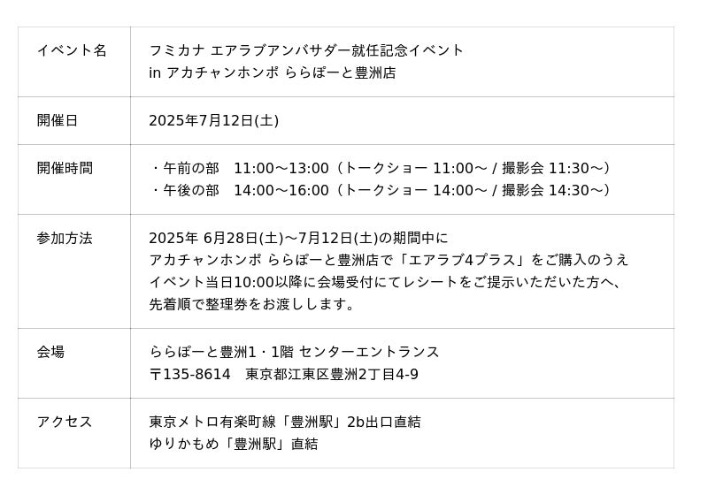 期間中にアカチャンホンポ ららぽーと豊洲店にて「エアラブ4プラス」をご購入いただいた方を対象に、各回先着50名様限定でフミカナさんによるトークショー優先観覧や写真撮影会、さらに本イベント限定のノベルティをご用意しております。