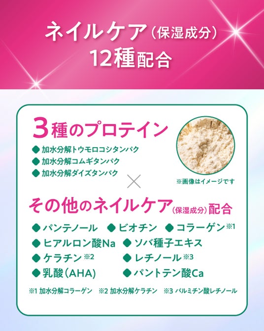 3種のプロテインをはじめとする12種のネイルケア成分(保湿成分)を配合しました 。