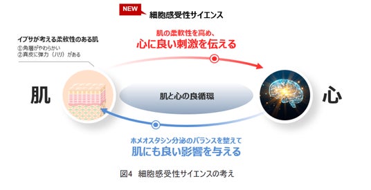 今回は、柔軟性のある肌に整えることで、触れた際の刺激が感覚受容器まで伝わりやすいということが新たに分かりました。また、ホメオスタシン分泌のバランスを正常に保つことが肌状態にとって非常に重要であることも過去に見出しています。このことから、柔軟性のある肌に整えることで、肌細胞の感受性が高まり、肌と心の良循環を促すことが期待できます(図4)。