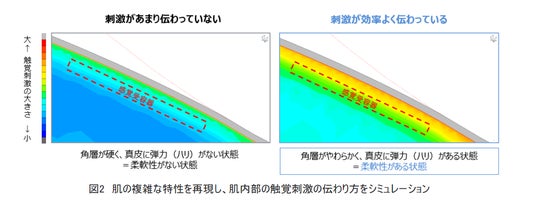 今回、これまでわかっていた肌内部の複雑な特性を、シミュレーション技術のパラメータにうまく落とし込むことで、肌内部への刺激の伝わりかたを確認できるようになりました。