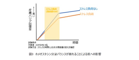 ホメオスタシンには様々な種類があり、五感で受け止める情報の種類、強さ、頻度などによって変化します。ホメオスタシン分泌のバランスが崩れた状態では、肌のもつ様々な生理機能に悪影響を及ぼし、正常な機能(ホメオスタシス機能)が低下することが分かっています。例えば、一定時間ストレスを与えることで、ホメオスタシン分泌が肌に与える影響を評価した結果、バリア機能の回復率が低下するという知見を過去に見出しています(図3)。