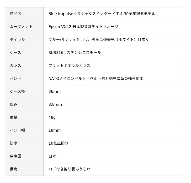 2025年に運用開始から30周年を迎えるブルーインパルスの運用機T-4。その節目を記念して企画された限定アニバーサリーモデルが登場。高視認ダイヤル、100m防水、ケース一体型リューズ、革補強NATOベルトなど本格ミリタリースペックを搭載し、腕回り約140~220mmに対応するユーティリティ設計。ファンの方にはもちろん、日常使いにも最適な一本です。