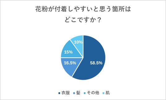 Dクリニックの調査では、花粉が付着しやすい箇所として、服と回答した人は59%、髪と回答した人は16%という結果となり、衣類には対策が出来ていても意外と髪までは気が回っていない方が多いことが分かりました。