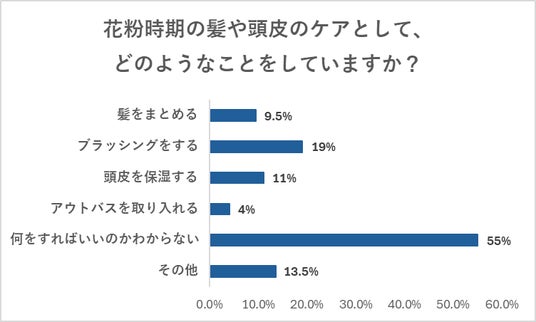 花粉時期の髪や頭皮のケアについて調査をしたところ、約半数の人が「何をしたらいいのかわからない(55%)」と回答しており、まだまだ対策方法などが浸透していないことが分かりました。二番目に多い回答としては、「ブラッシングをする(17%)」が挙げられ、次に「頭皮を保湿する(11%)」と続きました。花粉を落とすために適度なブラッシングは有効とされています。また花粉が頭皮や髪に付着すると、水分が奪われ、髪のパサつきや、頭皮の乾燥を引き起こしてしまい、フケやかゆみの原因となります。そのため頭皮を保湿することが大切です。その他にも、花粉が髪へ付着することを未然に防ぐ対策として、整髪料をつけることで髪に油分を適当に補ってあげるなどの対策を行ってみるのも良いかもしれません。