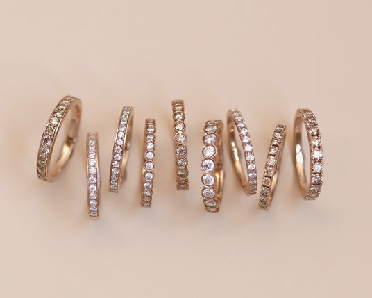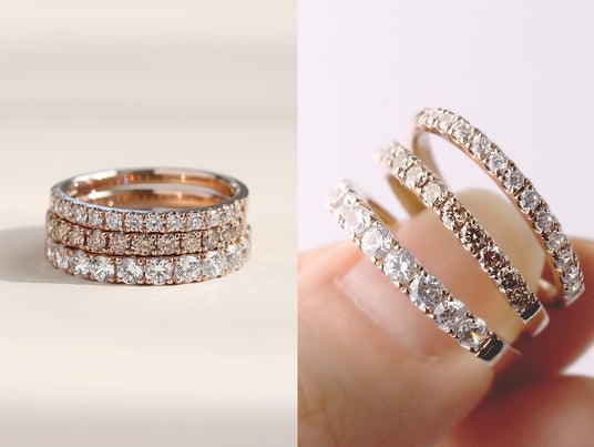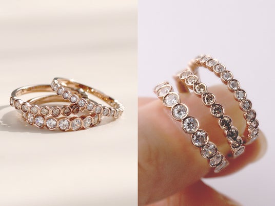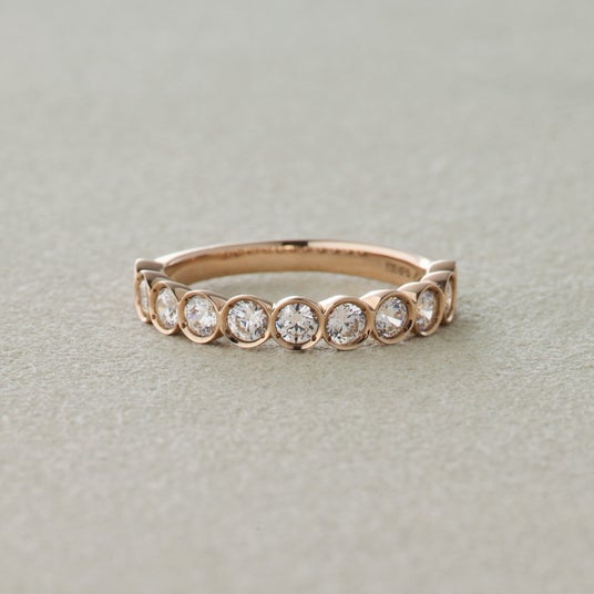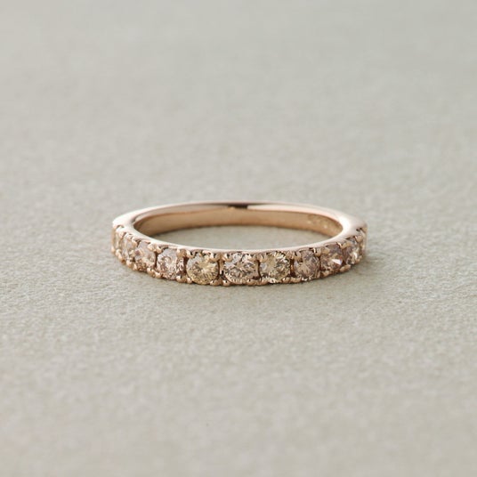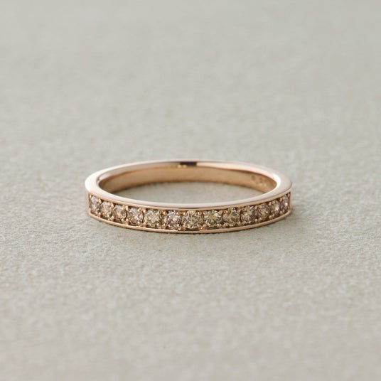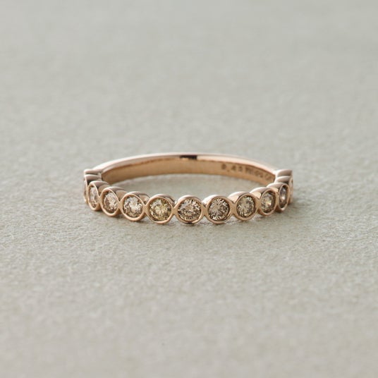 宝石をしっかりと保護するようにダイヤの周りを地金で囲んだベゼル。引っ掛かりが少なく安心感のある着け心地で普段使いに最適のデザインです。光の吸収率が低いため華美になりすぎず上品に手元を彩ってくれます。モダンでありながらフォーマル過ぎない、ファッション性の高さから個性的で美しい色合いのシャンパンダイヤモンドがしっくりくるデザインです。