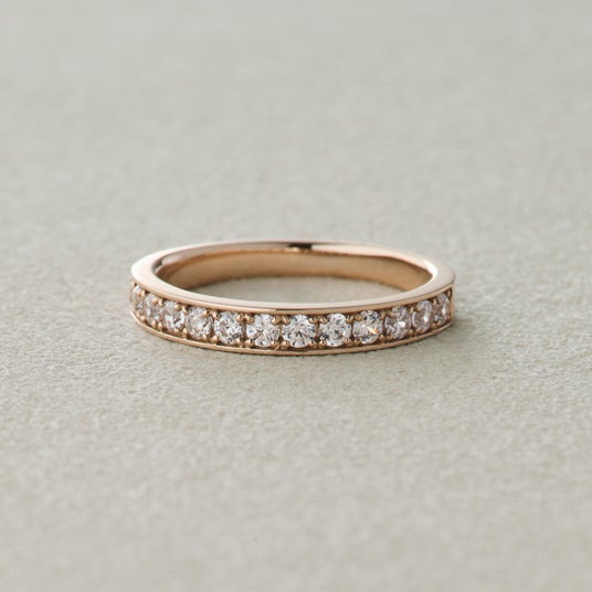 一つのダイヤモンドを4つの爪で留めたデザインのハーフエタニティリング。 隣り合うダイヤを一つのツメで留める共有爪の留め方もありますがエタニティリングをデイリーに楽しんでいただけるよう安心な強度を保つ“4本爪”デザインに。 プロングはレールやベゼルに比べ最も金属部分が目立ちにくく、ダイヤモンドの露出が多い留め方になっています。ダイヤの煌めきを存分に味わいたいという方におすすめのデザインです。