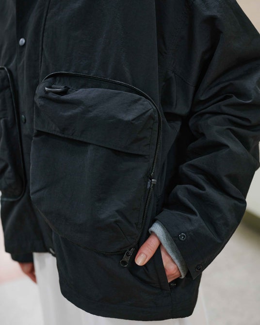 第一弾となる撥水トラベルパーカーは、移動中・機内・旅先での外出まで、幅広いシーンで活躍する一着です。顔まわりまで覆える仕様のフロントジッパーにより、周囲の視線や光が気になりにくく、移動中も落ち着いて過ごせる設計です。さらに、収納力のあるポケットやパッカブル仕様など、旅先で役立つ工夫を随所に施しました。撥水素材を使用し、急な天候の変化にも対応。ミニマルなデザインで装いを選ばず、旅の相棒として頼れるトラベルウェアです。