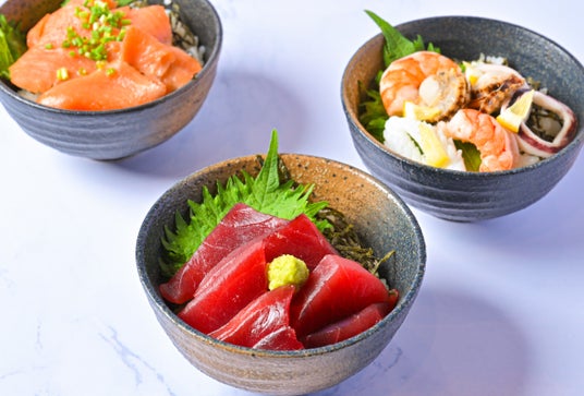 まぐろ・サーモン・たこ・甘えびなど、彩り豊かな海の幸をご用意。お好みの具材を乗せて、朝から贅沢な自分だけの一杯をお楽しみください。