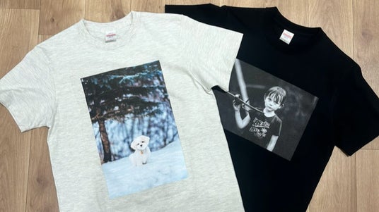 店内の商品からお好きな無地のウェアをお選びいただき、お客さまのお写真やイラストを最短20分でプリントできるサービスです。