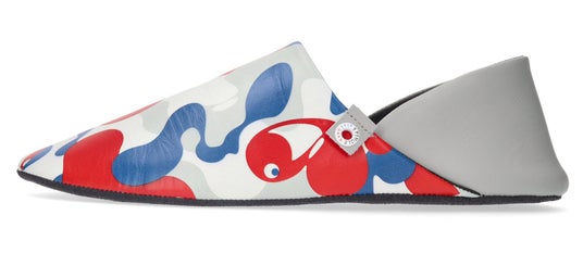 踏み抜き防止機能を有する「ゼロハザードインソール」を装備したルームシューズ「SP-1781」がベースです。甲の部分に大阪・関西万博の特徴的なエレメント柄を大胆にプリントしたレザーをたっぷりと使用したインパクトのある1足です。シューズボックスは、大阪・関西万博の公式キャラクター「ミャクミャク」をあしらった特別仕様です。