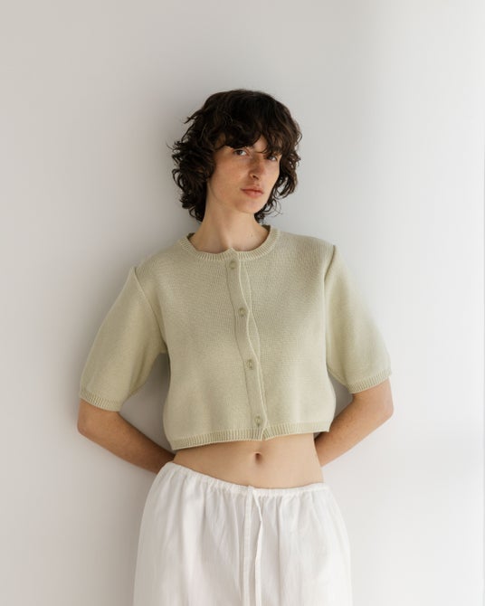 少しフォルムをつけた袖がポイントのハーフスリーブニットカーディガン。ジャストなストレートシルエットの着丈と、長めにとった袖の絶妙なバランスが抜け感のあるラフな女性らしさをプラスします。
