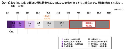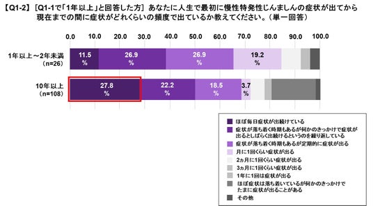 1.慢性特発性じんましん患者さんのうち、約4割が人生で最初に症状が出てから現在までの期間が「10年以上」と回答。4人に1人は「ほぼ毎日症状が出続けている」人生で最初に慢性特発性じんましんの症状が出てから、現在までの期間をお聞きしたところ、「10年以上」と回答した人が39.0%でした。「1年以上」となると82.7%の人が該当し、慢性特発性じんましんは、すぐに治る疾患ではなく、数年にわたり症状を抱えている患者さんが多いことが分かります。継続した治療の重要性がうかがわれます。症状が出る頻度をお聞きした設問では、10年以上続いている人の27.8%は「ほぼ毎日症状が出続けている」と回答しており、決して“たいしたことない病気”ではないことが浮き彫りとなりました。