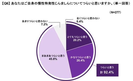 6.慢性特発性じんましんが「つらい」と思っている人は9割超。つらさの度合いは「まあまあつらいと思う」と回答している人が多く、症状への慣れから「つらさ」を過小評価している可能性がある