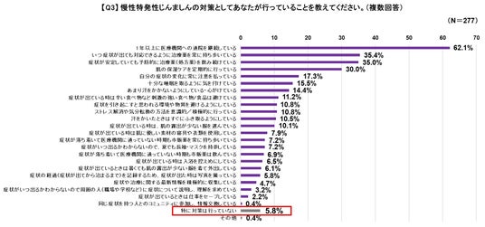 - 慢性特発性じんましんについて「特に対策を行っていない」と回答した人は5.8%。9割以上の患者さんが様々な対策を行っている
