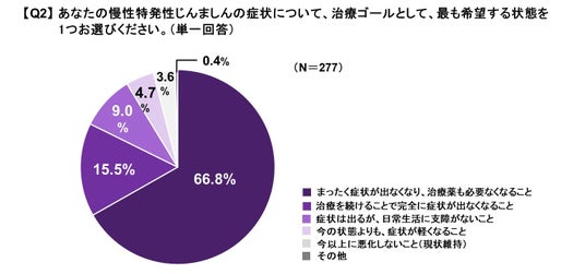 - 慢性特発性じんましん患者さんの目指す治療ゴールの最多は「まったく症状が出なくなり、治療薬も必要なくなること」 で66.8%