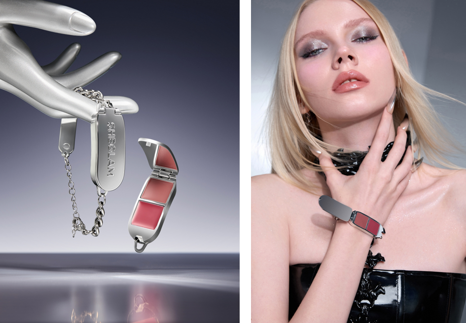 「Lip Link Mini Gloss Bracelet Palette」は、ツヤ感のあるリップカラー2色をブレスレット型ケースに収めたユニークなアイテム。外出先でのメイク直しはもちろん、アクセサリー感覚で身に着けられるデザインも魅力です。