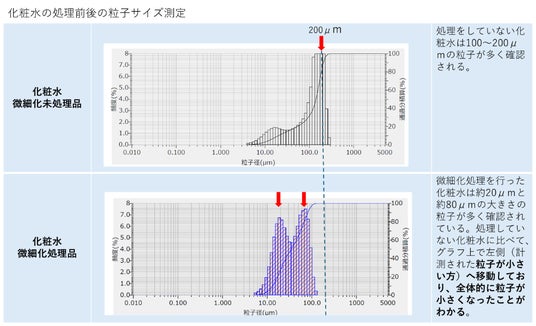 実測データが証明する 「微細化」の成果粒子径分布の測定において、従来の製法では100~200µmであった粒子が、本製法を用いることで約20µmおよび約80µmのサイズへ大きく移動し、全体的に粒子が微細化されていることが確認されました。