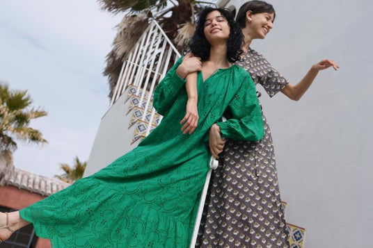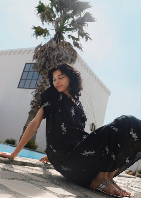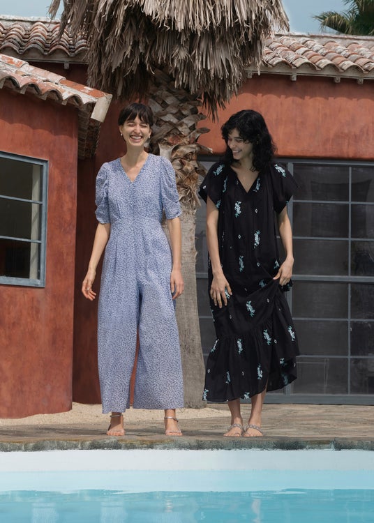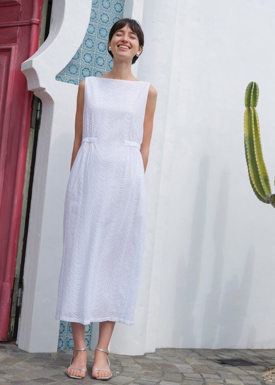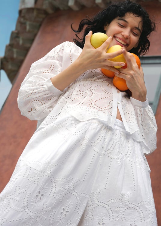 ハリ感のあるコットンオーガンジーにストライプ状のカットワーク刺繍を施したオフショルダートップスやフレアドレスは、小さな光の粒が流れ落ちるような透け感が夏の装いに涼やかな華やぎを添えます。また、インドの伝統的な刺繍技法であるシフリー刺繍をより繊細なカッティングで表現したシリーズも登場。草花の連なりを思わせる穴あきレースが、スクエアネックのIラインドレスやフレンチスリーブトップス×パンツのセットアップなど、大人のリラクシングスタイルを軽やかに演出します。