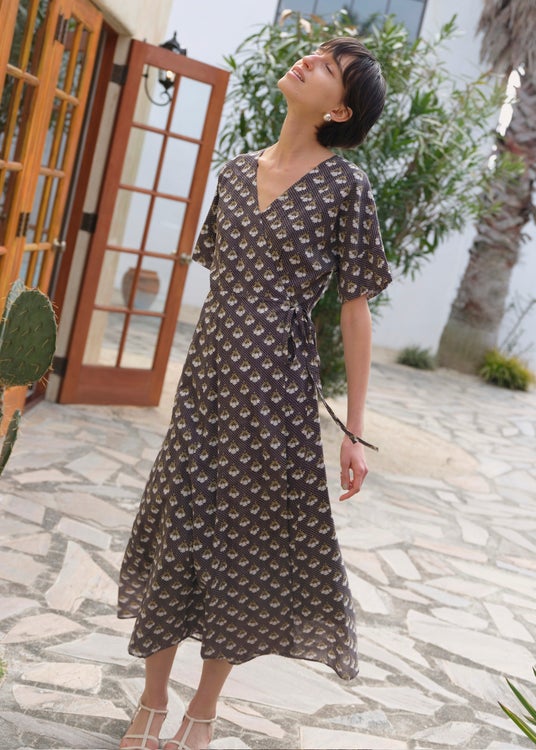 盛夏~晩夏まで纏いたい細かなチェック柄にリリーのモチーフプリントを重ねたカシュクールドレスは、ヴィンテージライクな表情が魅力でタウンからリゾートまでシックに彩る一着。