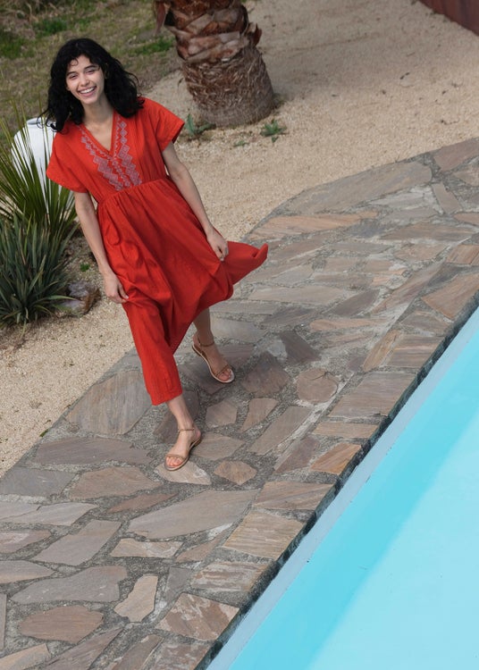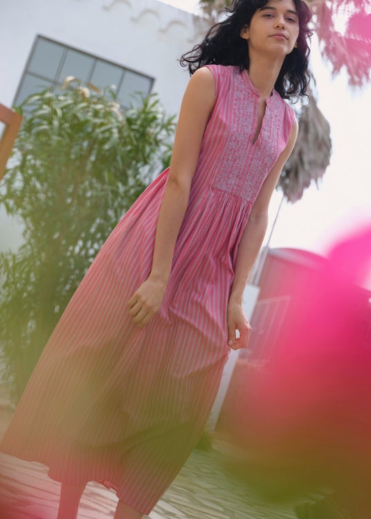 香り立つような艶のあるジャスミンの花穂の刺繍や、鮮やかなピンク、トマトレッド、グリーンなどのカラーパレットに思わず目を奪われる新作。ルピナスの花を描いたカットワークと裾の有機的なスカラップが美しいロングドレスやセットアップは、レースから透ける夏の日差しにも心躍ります。ジャカード織り生地やオリジナルのストライプ生地の胸元に刺繍を施し、手仕事の重なりで豊かな表情を纏うサマードレスなど、手仕事の魅力をモダンな感性で再解釈し、日常にも旅先にも寄り添うアイテムへと落とし込みました。