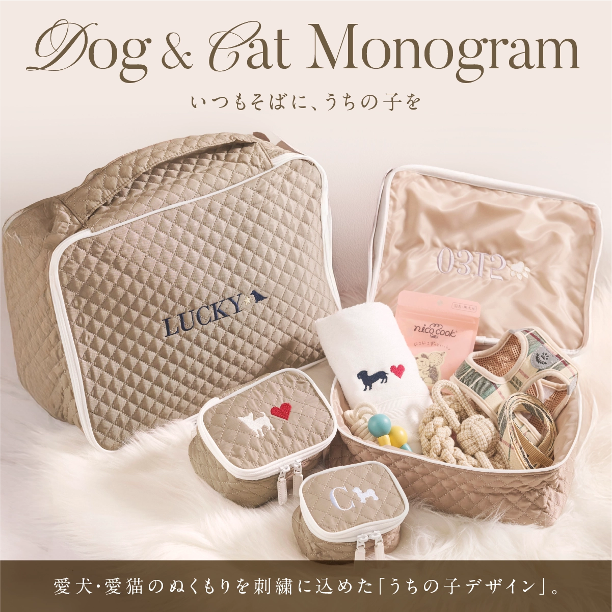 お散歩グッズをまとめるポーチや、日常使いのアイテムに刺繍を添えることで、日常のふとした瞬間に、“うちの子”の愛らしい存在を感じていただけます。