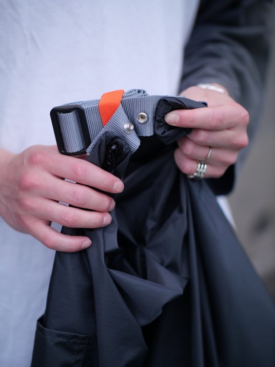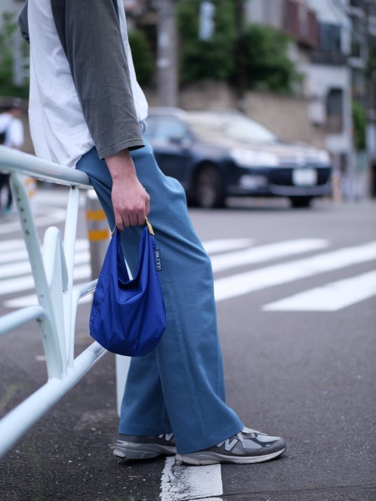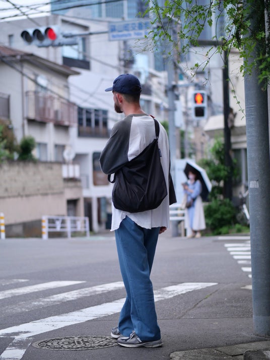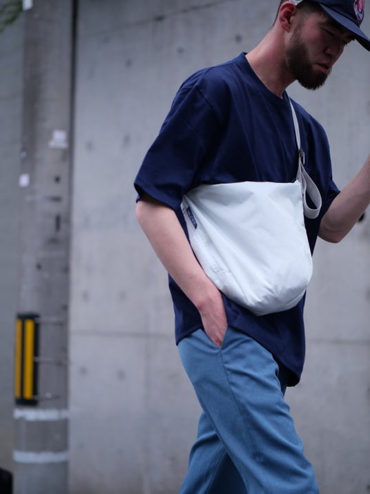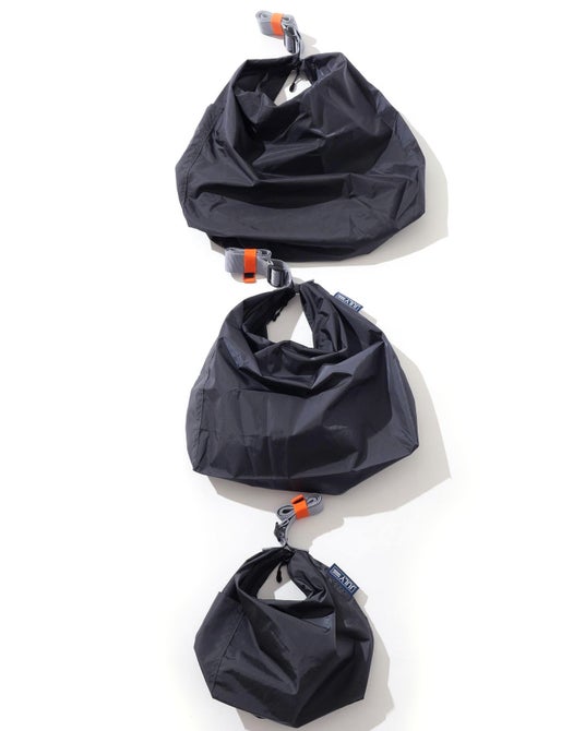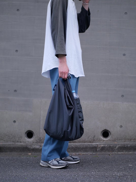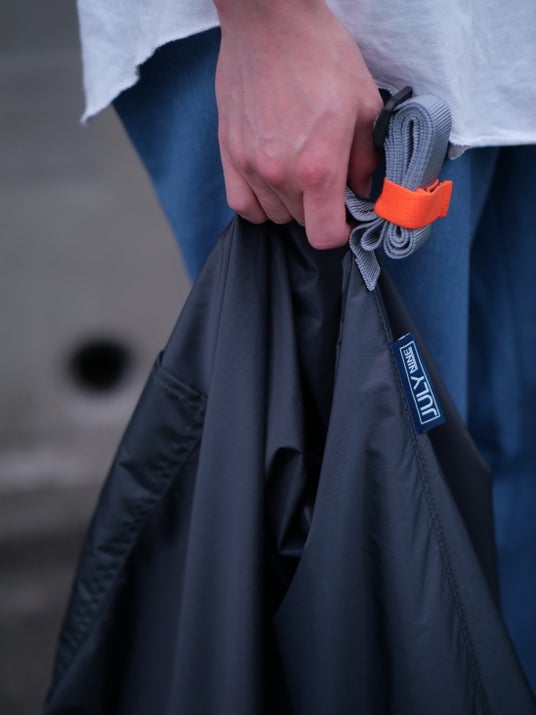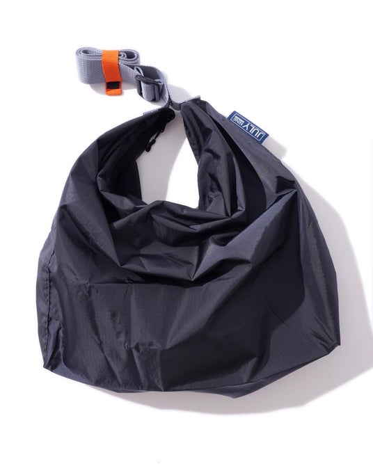 〈JULY NINE〉の象徴ともいえるパッカブル仕様はあえて採用せず、スナップボタンの位置をアレンジすることで、巾着のような2WAY仕様に。余ったストラップは付属のボムバンドでまとめられるなど、実用性にも配慮された仕上がりです。夏場のレジャーなど、背負わずに手持ちしたいシーンでも活躍します。