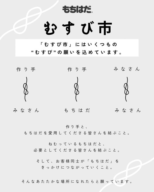 もちはだ(R)は、ひとつひとつ職人の手で作られています。 しかし手作業だからこそ、ごく小さなキズや起毛の具合の不揃いなどが生じ、着心地やあたたかさに問題はないにもかかわらず、販売されずに眠ってしまう製品が存在します。 せっかく心を込めて作られた一枚を眠らせるのではなく、 大切に着てくださる方のもとへ届けたい。 そんな思いから、毎月第3週の土日に開く「むすび市」をはじめます。