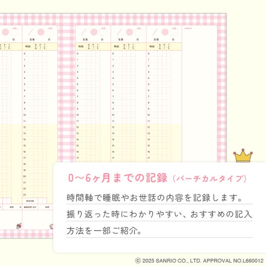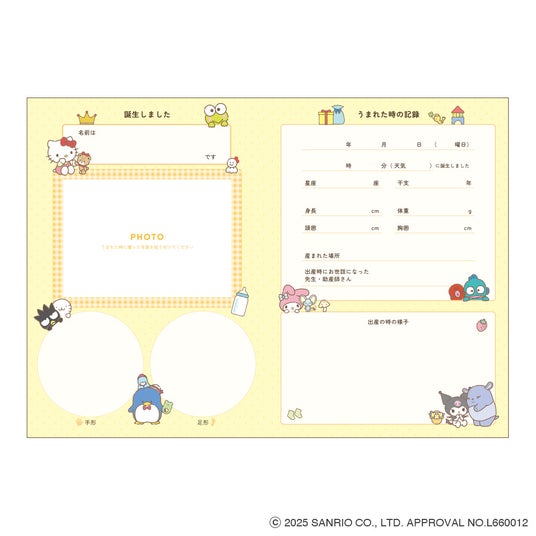 この育児日記は、妊娠中から1歳のお誕生日までのかけがえのない日々を、サンリオのキャラクターたちと一緒に楽しく記録できる一冊です。 忙しい毎日の中でも書きやすい工夫が満載で、記録するたびにほっこりと癒される、ご家族に寄り添うデザインとなっています。