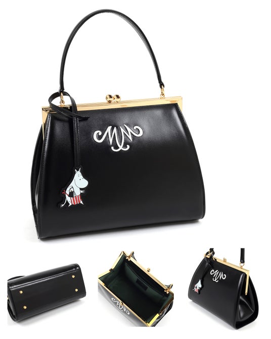 ムーミンママが大切にしているハンドバッグをイメージしたハンドバッグ。ツヤのある上品な牛革に、特徴的なマークを刺繍であしらいました。特徴的ながま口は、大きく開くので出し入れもスムーズです。着脱できるムーミンママのチャームが付属。底鋲付きなので直置き時も安心です。