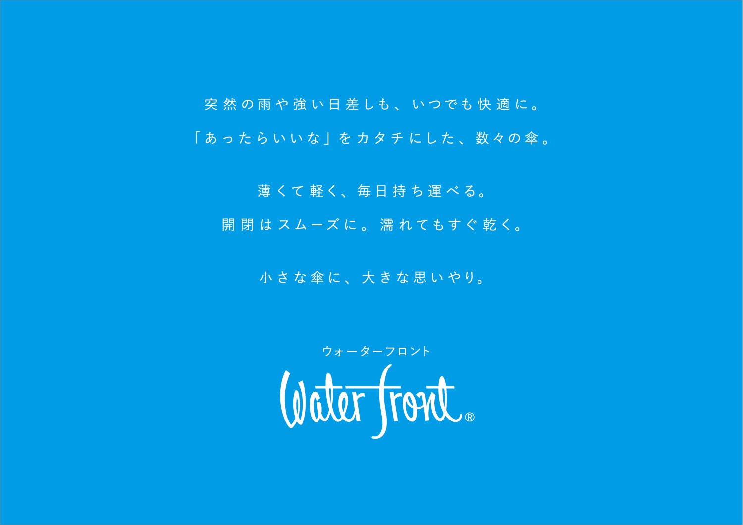 1986年創業の傘ブランドWaterfrontは、累計販売本数2億本を超え、老若男女さまざまなライフスタイルの中でご愛用いただいています。現在まで常に独自の高い機能を追求し、また手頃な価格でお客様の多様なニーズに応えてきました。中でも持ち運びのしやすさに特化した薄型傘「ポケフラット」は累計販売本数2,400万本を超える代表商品です。2022年最高水準の日傘「COKAGE+」、また2023年には、機能性とデザイン性を兼ね備えたレディースブランド「umbulatio(アンブラティオ)」を発表しました。2025年、株式会社ウォーターフロントへ社名を変更、さらに株式会社TSIホールディングスのグループ会社となり、Waterfrontのさらなるブランド価値向上を目指してまいります。
